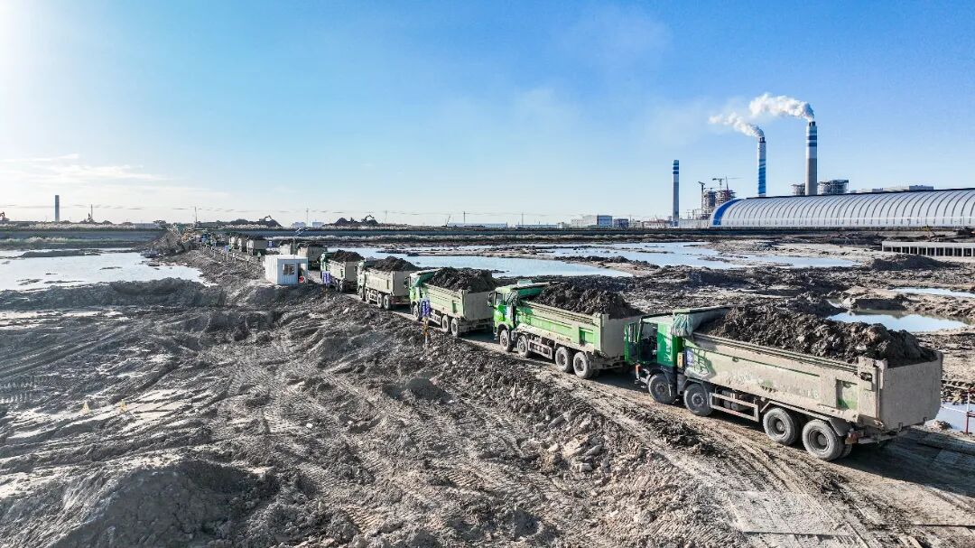 多臺挖掘機(jī)、運(yùn)輸車往來穿梭