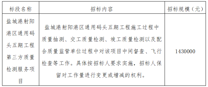 一、江蘇鹽城港射陽港開發(fā)集團(tuán)有限公司負(fù)責(zé)實施的鹽城港射陽港區(qū)通用碼頭五期工程第三方質(zhì)量檢測服務(wù)項目已具備招標(biāo)條件,項目所需資金已落實,現(xiàn)通過公開招標(biāo)方式邀請潛在投標(biāo)人參加本項目的投標(biāo)。