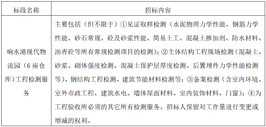 8、項目標段劃分:響水港現代物流園(6座倉庫)工程檢測服務共為1個標段,標段信息如下: