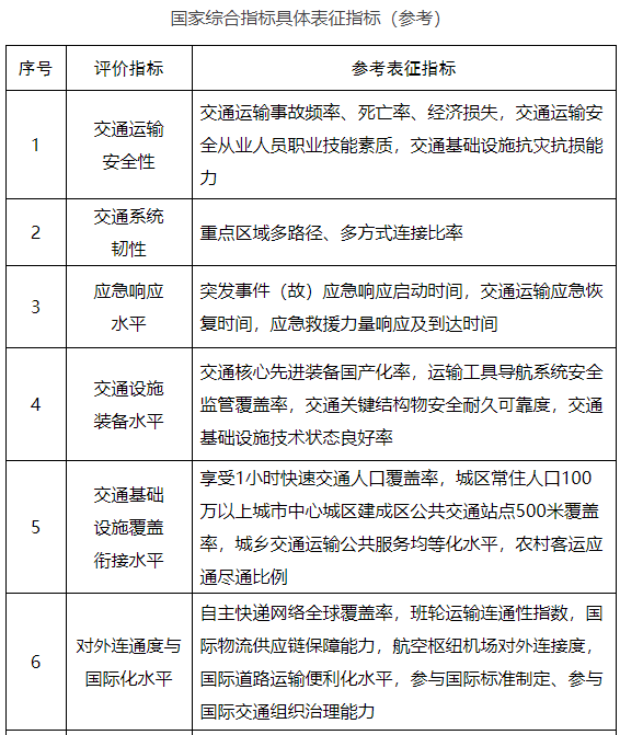 為深入貫徹落實《交通強國建設(shè)綱要》《國家綜合立體交通網(wǎng)規(guī)劃綱要》,客觀評估交通強國建設(shè)進程,充分發(fā)揮評價指標(biāo)體系的“標(biāo)尺”和“指揮棒”作用,科學(xué)引導(dǎo)各地區(qū)、各行業(yè)加快建設(shè)交通強國,我們研究制定了《交通強國建設(shè)評價指標(biāo)體系》,經(jīng)報國務(wù)院領(lǐng)導(dǎo)同志同意,現(xiàn)予印發(fā)。