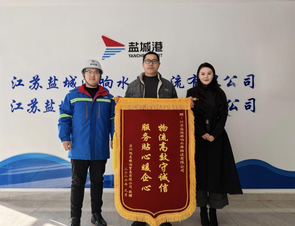 近日,響水港區(qū)收到一面來自蘇州旭友糧食貿(mào)易有限公司,印有“物流高效守誠(chéng)信,服務(wù)貼心暖企心”的錦旗,不僅見證了兩家企業(yè)攜手共贏的深厚情誼,更是對(duì)港區(qū)優(yōu)質(zhì)、高效、貼心服務(wù)的充分肯定。