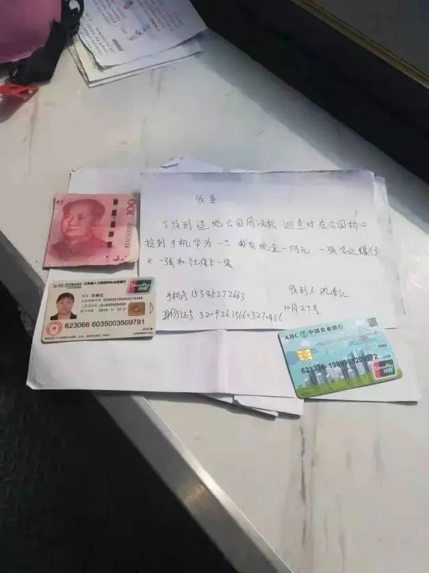 11月9日,鹽城港物業(yè)保安周漢松和往常一樣在所屬項(xiàng)目東郊公園內(nèi)巡邏執(zhí)勤,巡邏中發(fā)現(xiàn)馬路上“躺”著一部手機(jī),經(jīng)檢查手機(jī)外觀未損壞能亮屏,手機(jī)背面還有銀行卡、社保卡及少量現(xiàn)金。周漢松第一時(shí)間將現(xiàn)場(chǎng)情況進(jìn)行上報(bào),并時(shí)刻注意著手機(jī)來(lái)電。很快便接到了外來(lái)電話,來(lái)電人自稱是失主,周漢松在電話里告知對(duì)方方位,請(qǐng)對(duì)方到達(dá)現(xiàn)場(chǎng)進(jìn)一步確認(rèn)。