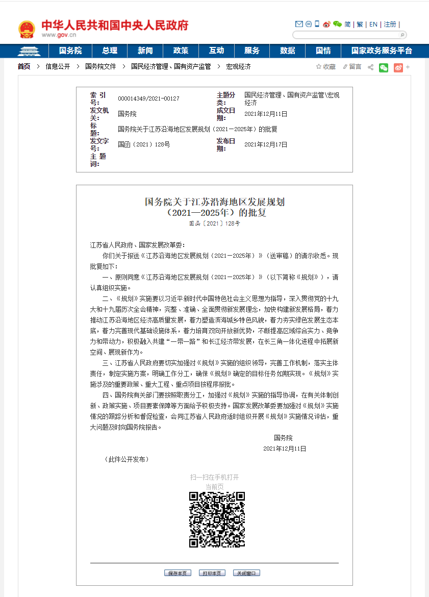 一、原則同意《江蘇沿海地區發展規劃(2021—2025年)》(以下簡稱《規劃》),請認真組織實施。