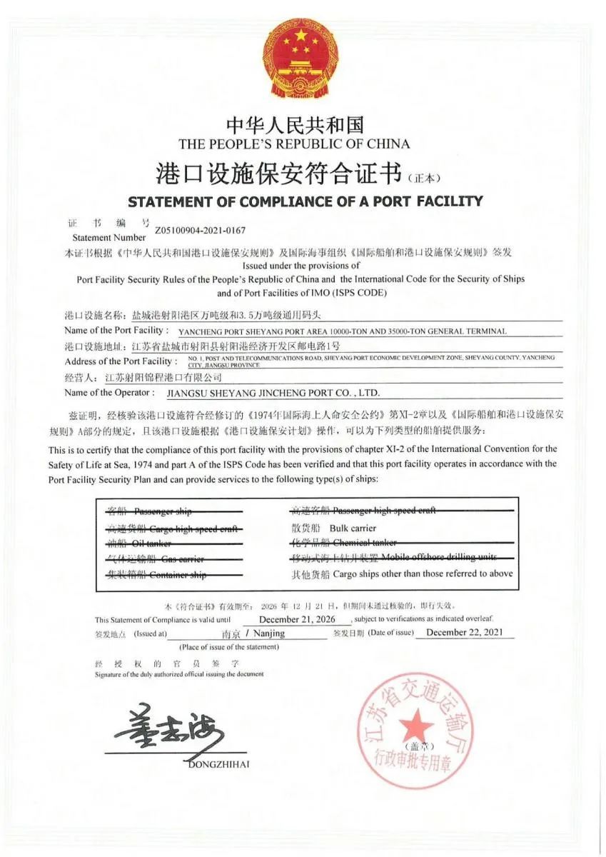 12月21日,經(jīng)過射陽港區(qū)項目條線人員近三個月的不懈努力,在各主管部門和專業(yè)咨詢單位的支持配合下,鹽城港射陽港區(qū)順利取得江蘇省交通運輸廳核發(fā)的港口設(shè)施保安符合證書,這一證書的成功獲批,為射陽港區(qū)一類開放口岸國家級驗收奠定了堅實基礎(chǔ)。