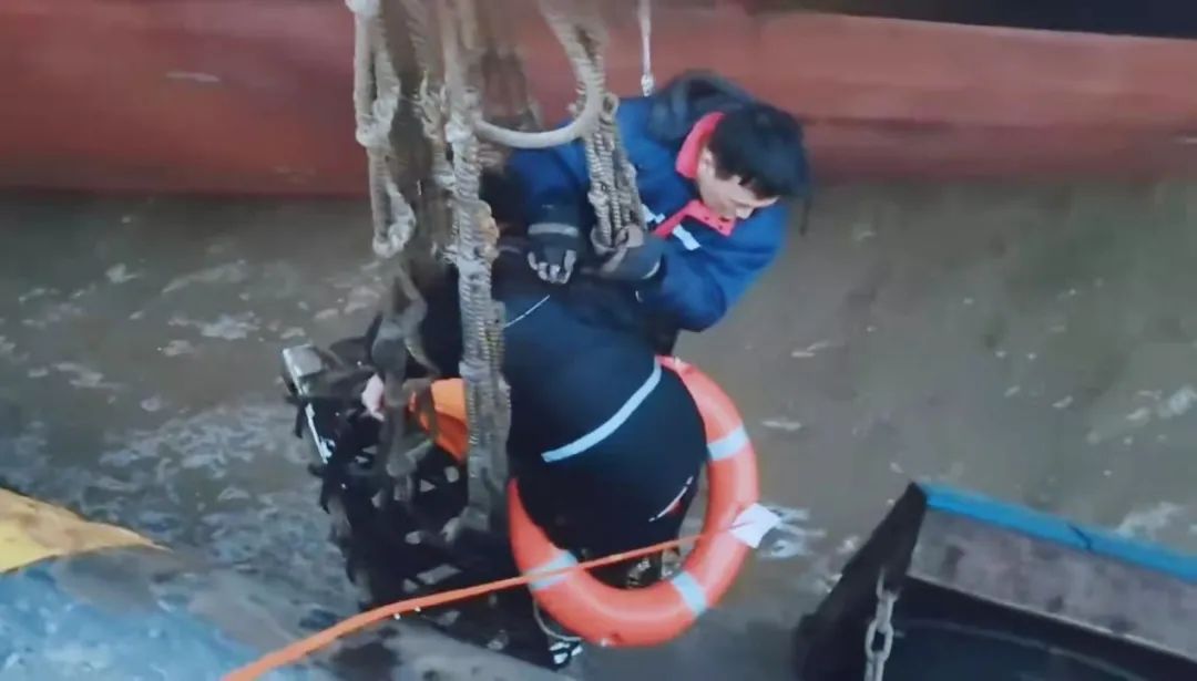 套好救生圈,拉緊救生繩,再配合船上吊機,一拖一拽之間成功將落水船員救上岸,整個救援過程僅僅用了5分鐘。據了解,落水船員目前生命體征正常,精神狀態良好。