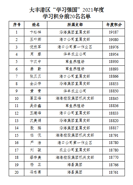新的一年,為表彰先進(jìn)、激勵(lì)后進(jìn),持之以恒地提高港區(qū)全體干部職工的學(xué)習(xí)自覺性和主動(dòng)性,進(jìn)一步加強(qiáng)學(xué)習(xí)型黨組織建設(shè)。近日,大豐港區(qū)舉行“學(xué)習(xí)強(qiáng)國”2021年度先進(jìn)個(gè)人頒獎(jiǎng)儀式,根據(jù)“學(xué)習(xí)強(qiáng)國”APP大豐港區(qū)年度學(xué)習(xí)積分排名,對(duì)成績突出的前20名“學(xué)習(xí)達(dá)人”代表進(jìn)行了表彰,并頒發(fā)榮譽(yù)證書。