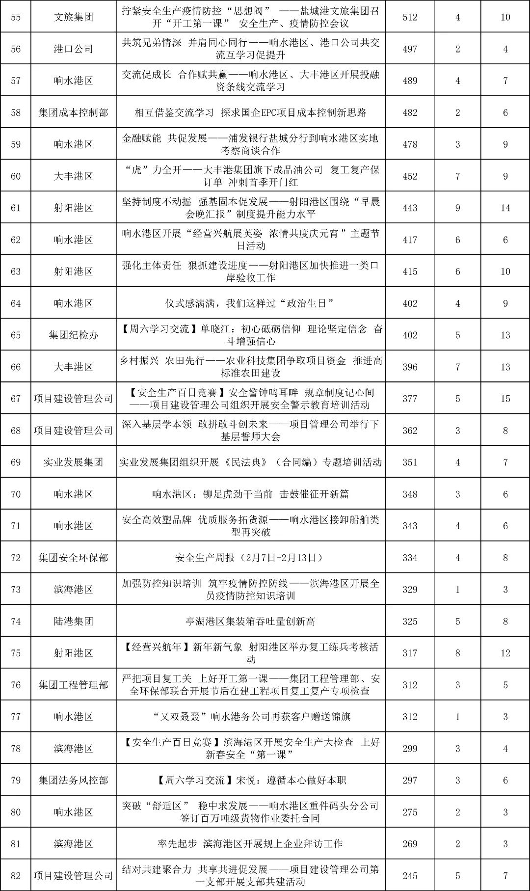 “首季開門紅”向來是新聞報(bào)道的高產(chǎn)期,特別是一線生產(chǎn)單位亮點(diǎn)頻出。從二月份稿件數(shù)據(jù)統(tǒng)計(jì)來看,大豐港區(qū)依然蟬聯(lián)第一“寶座”,發(fā)稿18篇;港口公司繼續(xù)發(fā)力,成稿11篇,位列第二;響水港區(qū)緊隨其后,發(fā)稿9篇。其他單位齊齊發(fā)力,紛紛積極供稿!