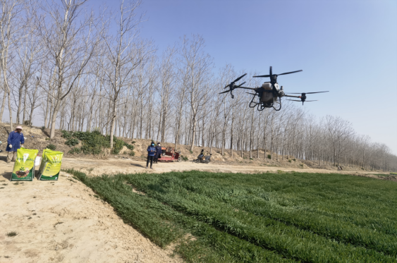 農業(yè)集團按區(qū)域制定生產服務指導方案,組建“黨員志愿隊”進行志愿服務、實行區(qū)域網格化管理、建立微信群及時發(fā)布指導意見。為減少勞務人員聚集,提高效率,“黨員志愿隊”為種植戶提供“飛防”服務,100斤的肥料只需短短幾分鐘的時間就可以播撒完成。“網格員”直接到田間地頭,現(xiàn)場指導種植戶種植、病蟲害防治要點,還提供全天候“云指導”服務,確保實現(xiàn)糧食豐收。