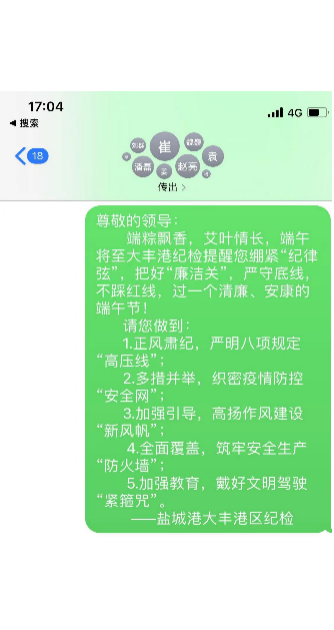 “繃緊‘紀(jì)律弦’,把好‘廉潔關(guān)’,嚴(yán)守底線,不踩紅線,過一個清廉安康的端午節(jié)!”為進(jìn)一步增強(qiáng)全體干部職工廉潔自律意識,鹽城港大豐港區(qū)紀(jì)檢常態(tài)化開展警示教育活動,以發(fā)送廉政短信、發(fā)放廉潔提醒等形式將廉政教育抓好抓實(shí)。