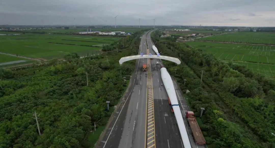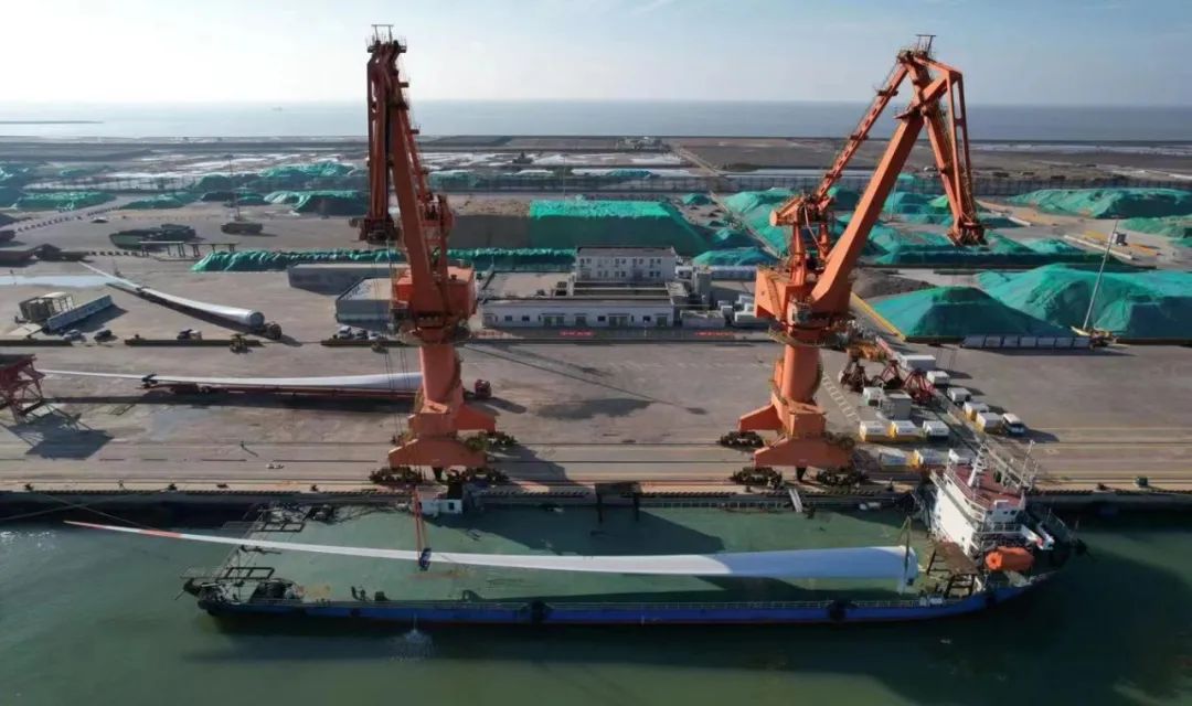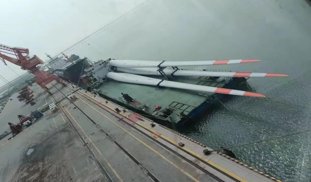 國電投山東海陽項目首套風電設備系濱海港建港以來進港海運最大的風力葉片,全長97米。此次運載的風力葉片從南通運至濱海港區(qū)碼頭,由于該葉片體身長,運輸過程中涉及安全系數(shù)較大,為確保萬無一失,從327省道轉(zhuǎn)入濱海港區(qū)后,生產(chǎn)經(jīng)營條線安排專班人員實時跟蹤服務,及時協(xié)調(diào)清理影響拐彎的部分隔離護欄,保障途中各轉(zhuǎn)彎要道口的通行安全,順利抵達目的地——濱海港碼頭1號泊位。至此,三根風葉片全部被安全高效地裝載上貨輪,運往國電投山東海陽目的地。