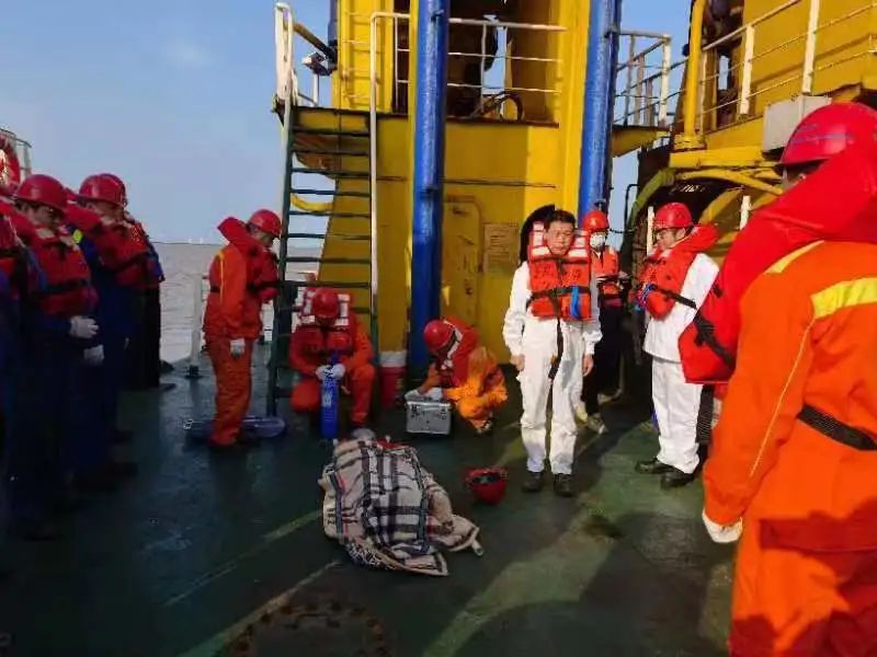 隨后進行的是人員落水演習。“報告,皮龍隊一人整理皮龍帶時不慎落水?!薄疤旎⑻枴贝L接報后立刻指令駕駛員發出有人落水警報,并通知交通船協助救援,同時向項目部、公司調度室報告人員落水情況;打撈隊將落水人員救撈上來后,救護隊采用控水、心肺復蘇等急救措施對落水人員進行模擬救助,經搶救后落水者蘇醒,船長安排相關人員將落水者送往醫院接受進一步檢查。