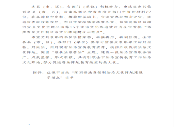 近期,由鹽城市委宣傳部、市委依法治市辦、市法宣辦、司法局4個部門單位發布關于公布鹽城市首批“落實普法責任制法治文化陣地建設示范點”的通知,江蘇鹽城港射陽港開發集團有限公司榮獲相關稱號。