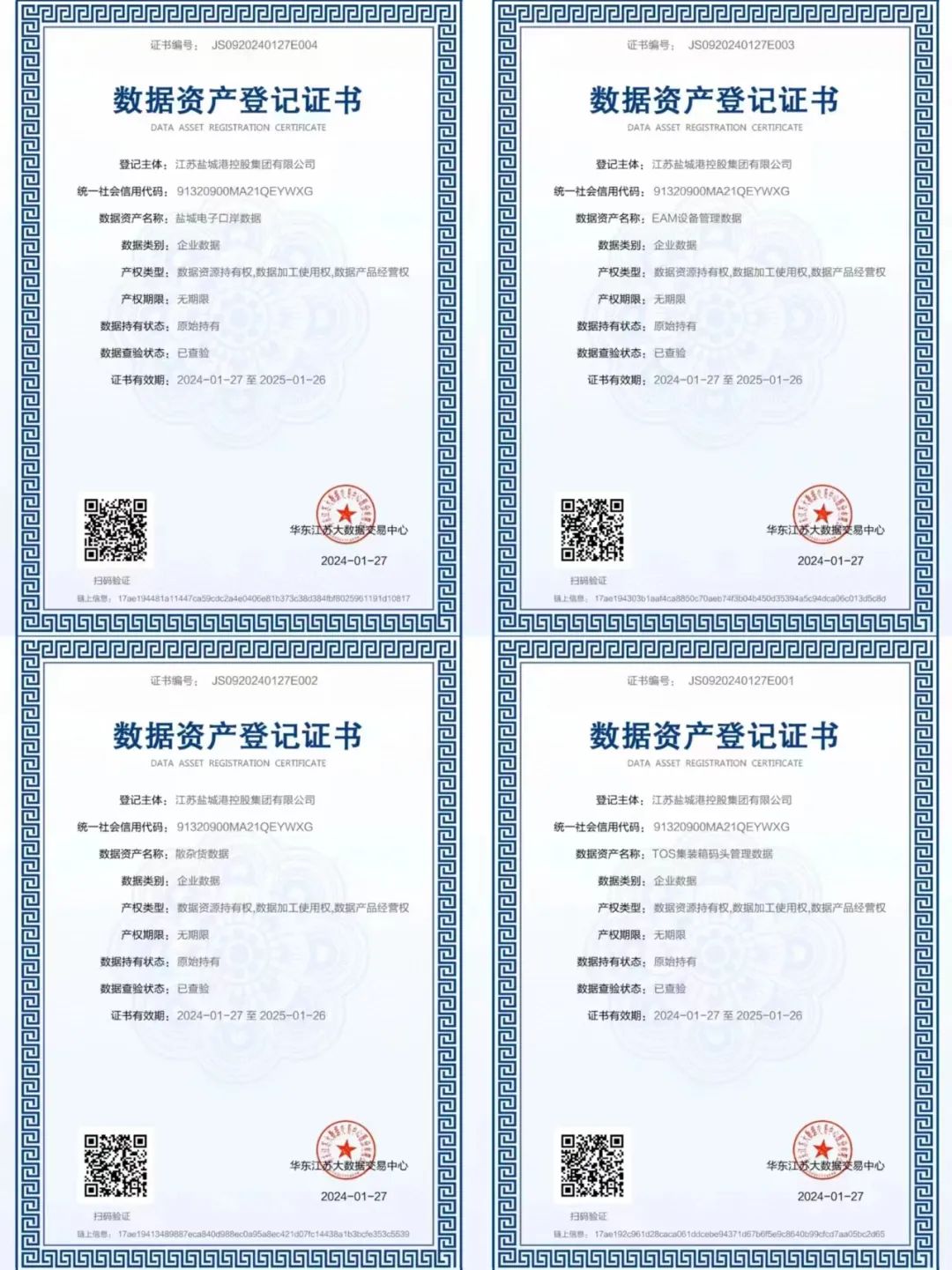 日前,鹽城港集團(tuán)順利完成集裝箱碼頭生產(chǎn)操作系統(tǒng)(TOS)、電子口岸系統(tǒng)、港機(jī)設(shè)備物資管理系統(tǒng)(EAM)、散雜貨生產(chǎn)管理系統(tǒng)(MES)數(shù)據(jù)資產(chǎn)質(zhì)量評價(jià)及價(jià)值評估,并獲得《數(shù)據(jù)資產(chǎn)登記證書》,成為鹽城市首批完成數(shù)據(jù)資產(chǎn)登記的企業(yè)之一,也是全國首個(gè)港口企業(yè)數(shù)據(jù)資源入表案例。