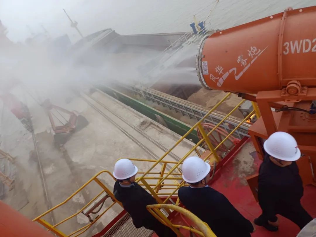 在碼頭散貨裝卸過(guò)程中實(shí)施全程水霧抑塵與作業(yè)噴淋管理;散貨堆場(chǎng)堆碼嚴(yán)格做到全面、及時(shí)苫蓋;明確運(yùn)輸車(chē)輛封閉性、貨物苫蓋、裝貨高度以及車(chē)輪沖洗等規(guī)定;港區(qū)內(nèi)道路全天保證完整濕式清掃4次以上,白天實(shí)行不間斷灑水。確保在“生產(chǎn)性”揚(yáng)塵形成初期,編織起一張“立體防護(hù)網(wǎng)”。