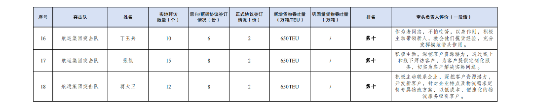 第一名:巾幗突擊隊 李婷婷(拜訪客戶187家,簽訂意向協議45份,簽訂正式協議5份,新增貨物吞吐量48TEU,鞏固量貨物吞吐量68TEU)