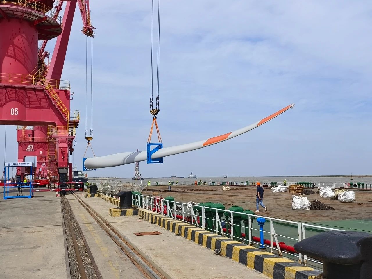 針對此次業務,射陽港區成立工作專班,以“全過程”“一站式”服務為抓手,與業務單位落實具體合作細節。一方面多次邀請物流單位至現場協調溝通葉片進場、落場、葉片清洗、短駁、裝卸指揮、船舶進出港等流程環節,并以沙盤演練的方式,提前部署解決各環節存在堵點;另一方面前往聯檢單位對接業務動態,在為客戶提供了“一站式”通關服務的同時,大大降低企業運輸成本和時間,真正從客戶視角出發,讓客戶體驗風電裝備進出口港的“港口+”全流程“定制化服務”。
