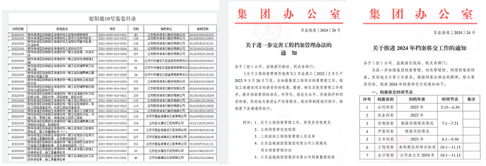 為切實做好工程項目檔案的精細化管理,射陽港區認真學習、貫徹執行鹽城港集團關于檔案精細化管理要求,在全體系、各層面、多角度上下功夫,堅持“標準化”整檔、“集約化”存檔、“數字化”建檔,不斷推動檔案管理數據化體系建立健全,為工程項目提供更加精準有效的數據支撐,保障項目進度暢通推進。