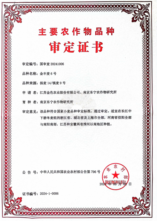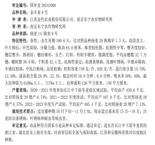 近日,農(nóng)業(yè)農(nóng)村部發(fā)布第五屆國家農(nóng)作物品種審定委員會第四次主任委員會會議審定通過的作物品種,農(nóng)業(yè)科技集團所屬金色農(nóng)業(yè)選育的小麥新品種“金豐麥6號”通過國家審定。
