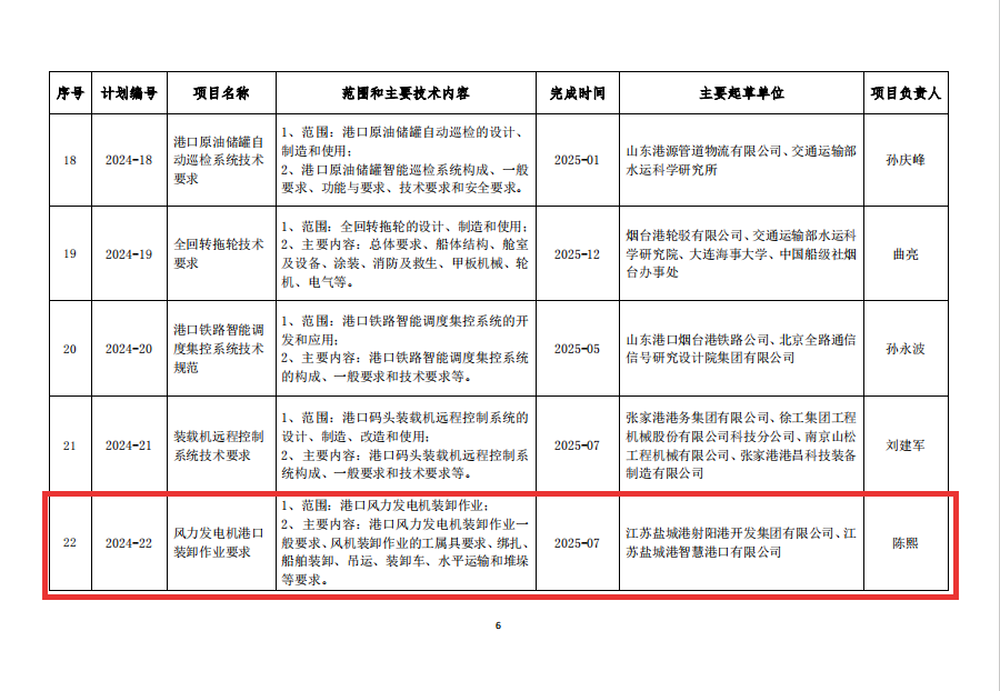 根據(jù)中國港口協(xié)會中港協(xié)行函〔2024〕30號文件精神,江蘇鹽城港射陽港開發(fā)集團(tuán)有限公司申報的《風(fēng)力發(fā)電機(jī)港口裝卸作業(yè)要求》成功通過《2024年度中國港口協(xié)會團(tuán)體標(biāo)準(zhǔn)化計劃》立項,這標(biāo)志著鹽城港港口風(fēng)力發(fā)電機(jī)裝卸作業(yè)將作為行業(yè)標(biāo)準(zhǔn)在港口作業(yè)行業(yè)進(jìn)行推廣。