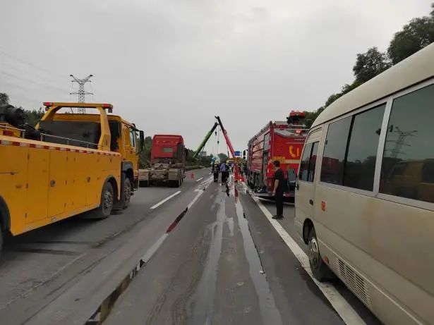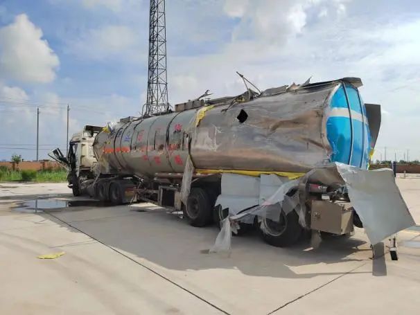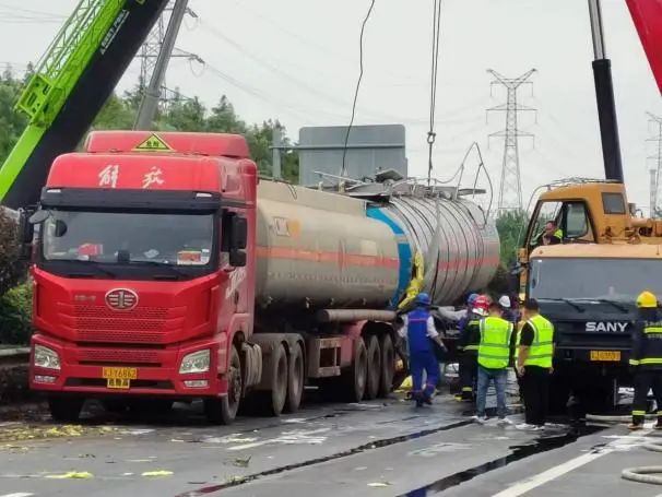 根據現場險情,公安交警部門第一時間封鎖事故現場,禁止一切車輛靠近,消防大隊出動消防車對事故車輛罐體進行噴射冷卻,聯系吊車對其進行罐體扶正工作,隨后由危化品運輸公司救援搶險隊使用相關設備將泄漏罐車內的“高沸點芳烴”進行抽取,并轉移至指定安全區域。