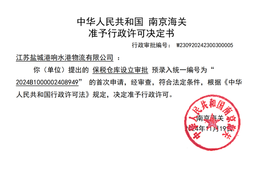 經(jīng)過一系列申報(bào)、審批流程,響水港物流有限公司公用型保稅倉成功獲得南京海關(guān)的行政許可,并于12月2日下發(fā)行政許可決定書。標(biāo)志著響水地區(qū)首個(gè)“公用型保稅倉庫”正式批準(zhǔn)設(shè)立。