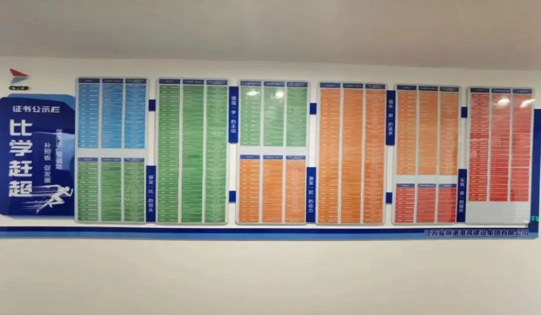 深化人才培養,營造比學趕超濃氛圍。全面實行A/B崗制度,合理分配“老中青”隊伍,通過項目一線鍛煉和培養中青年骨干人才。通過設立證書公示墻,激發全員“比學趕超”的考證氛圍,共考取一級建造師、二級建造師、高級工程師、中級工程師等證書15項,著力打造港航專業隊伍。