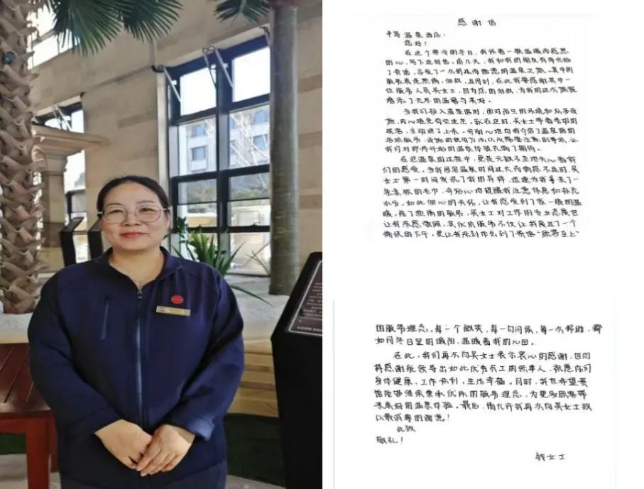 在港泊半島酒店,暖心的故事每天都在上演。近日,酒店收到了一封來自溫泉館客人的感謝信。信中,客人用真摯的筆觸,對溫泉館員工吳月華的服務賦予了極高的評價。為了弘揚這種敬業精神,樹立酒店服務的全新標桿,港泊半島酒店開展了向優秀榜樣吳月華學習的活動。每一位員工都積極響應,將熱忱融入日常服務的每一處。他們以實際行動詮釋著五星級酒店的品質與擔當,致力于為每一位賓客打造更加優質、貼心、溫暖的入住體驗,用心雕琢著港泊半島酒店的卓越口碑。