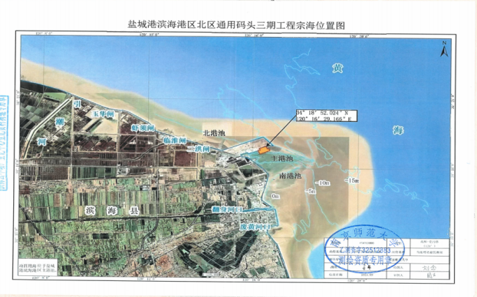 該工程位于鹽城港濱海港區主港池通用碼頭二期工程東側海域,用海類型為交通運輸用海中的港口用海,計劃新建2個10萬噸級泊位,用海申請總面積為22.6484公頃,其中透水構筑物用海為5.7860公頃,港池、蓄水等用海16.8624公頃,申請用海期限為50年(含施工期2年)。該項目建成后,將進一步提升濱海港區的吞吐能力,對保障臨港產業及周邊地區的原材料運輸具有十分重要的意義。