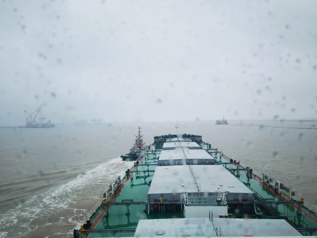 其中,濱海港區憑借挖入式港池的屏障作用,在抵御風雨中顯現優勢。值班引航員密切關注氣象預警,結合港區水文條件,科學嚴謹評估優化船舶進出港計劃。經反復研判,最終確定在高潮時段引領船舶進港。當日,盡管暴雨如注、能見度極低,引航員們無畏風雨、迎難而上。他們穿戴專業防護裝備,身著防雨斗篷與防滑雨靴,準時登輪作業。在一個半小時的緊張操作中,憑借精湛技藝和豐富經驗,引航員精準操控,成功將“華元503”輪安全平穩靠泊碼頭。