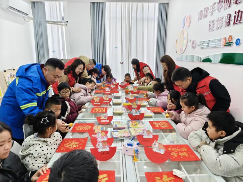 活動當日下午,在陳家港鎮未成年人保護工作站的圖書室里,20名留守兒童在志愿者的陪伴下認真閱讀課外書籍,沉浸在書香之中。隨后的游戲環節里,志愿者們與孩子們玩起擊鼓傳玩具的游戲,音樂聲時而急促、時而舒緩,每當鼓聲停下,拿到玩具的孩子便大方地說出一個帶“馬”字的四字詞語,現場歡聲笑語不斷。在手工制作室,孩子們在志愿者的耐心指導下,動手粘貼馬年玩具,并親手拓印出金光閃閃的“?!弊?,感受傳統文化的魅力?;顒幼詈螅懰蹍^志愿者們為孩子們發放了新年禮品和壓歲紅包,送上滿滿的新春祝福。