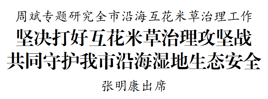 5月23日下午,市委書記周斌專題研究全市沿海互花米草治理工作。他強(qiáng)調(diào),要深入貫徹習(xí)近平總書記關(guān)于互花米草防治的重要批示精神,認(rèn)真落實(shí)國家和省相關(guān)部署要求,堅(jiān)持把互花米草治理作為促進(jìn)人與自然和諧共生的重大政治任務(wù),深入開展專項(xiàng)行動(dòng),堅(jiān)決守護(hù)好沿海生物多樣性和濕地生態(tài)系統(tǒng)安全。市委副書記、代市長張明康出席。