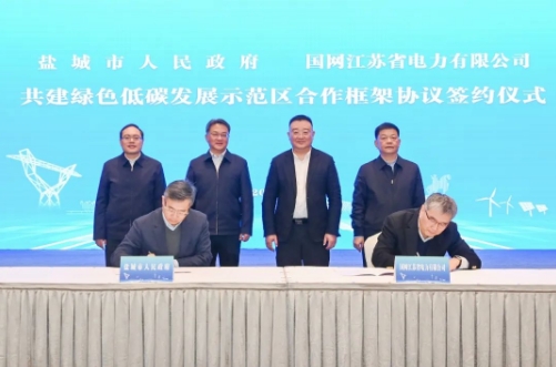 1月4日,鹽城市政府與國(guó)網(wǎng)江蘇省電力有限公司簽署共建綠色低碳發(fā)展示范區(qū)合作框架協(xié)議。市委書(shū)記周斌,市委副書(shū)記、市長(zhǎng)張明康會(huì)見(jiàn)國(guó)網(wǎng)江蘇電力董事長(zhǎng)謝永勝一行,并共同見(jiàn)證簽約。