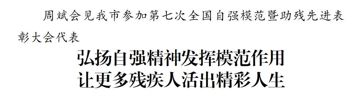5月26日,市委書記周斌會見我市參加第七次全國自強模范暨助殘先進表彰大會代表,向受表彰對象表示祝賀,向全市廣大殘疾人和殘疾人工作者致以問候,希望全市上下認真學習貫徹習近平總書記關于殘疾人事業(yè)的重要指示精神,全面落實中央和省委部署要求,讓更多殘疾人活出精彩人生,在新征程上推動我市殘疾人事業(yè)高質量發(fā)展。