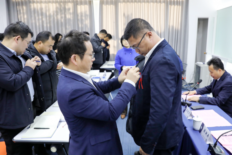典禮上,吳先華院長為學員代表佩戴?;?,吳先華、梁洪兵共同為鹽城港集團代表授予班旗,這也代表鹽城港的各位學員正式加入上海海事大學的大家庭。