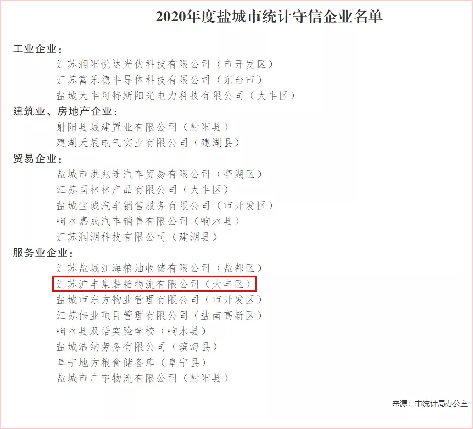 近日,通過(guò)嚴(yán)格審核,鹽城港滬豐集裝箱公司被鹽城市統(tǒng)計(jì)局評(píng)為“2020年度統(tǒng)計(jì)守信企業(yè)”,充分體現(xiàn)了滬豐公司重視和加強(qiáng)誠(chéng)信管理體系建設(shè)所作出的努力,對(duì)塑造公司誠(chéng)信經(jīng)營(yíng)形象、提升物流市場(chǎng)競(jìng)爭(zhēng)力具有重要意義。