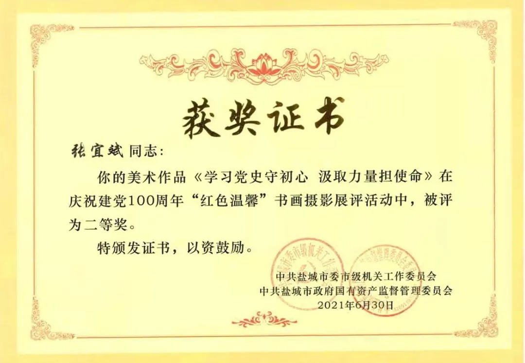 近日,中共鹽城市委市級機關(guān)工作委員會與中共鹽城市政府國有資產(chǎn)監(jiān)督管理委員會委員會發(fā)布《關(guān)于市級機關(guān)慶祝建黨一百周年“紅色溫馨”書畫攝影展評活動的表揚通報》,江蘇鹽城港控股集團有限公司工會聯(lián)合會榮獲“優(yōu)秀組織獎”,響水港區(qū)張宜斌同志獲得“美術(shù)作品類 二等獎”。