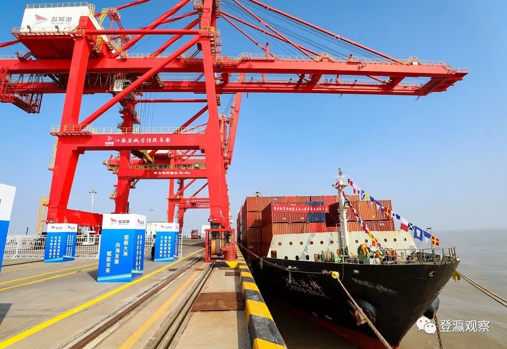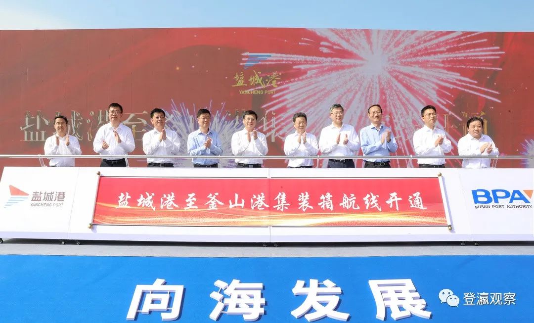 ▲鹽城港至韓國釜山港國際直達(dá)集裝箱班輪航線正式開航