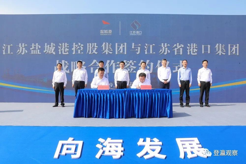 ▲江蘇鹽城港控股集團(tuán)與江蘇省港口集團(tuán)舉行戰(zhàn)略合作簽約儀式