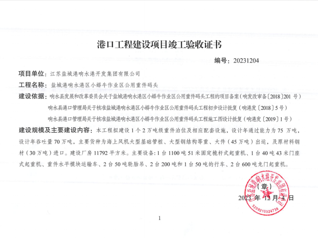 本工程位建設1個2萬噸級重件泊位(水工結(jié)構(gòu)兼顧5萬噸級船舶)及相應配套設施,碼頭前沿設置一臺最大起吊能力達1200噸的固定桅桿式起重機,是目前江蘇沿海港口起吊能力最大的專用重件碼頭。碼頭功能定位為以風電重、大件貨物為主,兼顧鋼材等件雜貨,設計年通過能力75萬噸。此次竣工驗收現(xiàn)場核查組由連云港海事局灌河海事處、連云港海事局響水海事大隊、鹽城市交通運輸局、鹽城市交通運輸綜合行政執(zhí)法支隊、響水縣交通運輸局、鹽城市響水工業(yè)經(jīng)濟區(qū)管委會等相關部門代表及5名特邀專家組成。在驗收會上,核查組認真聽取了項目參建單位的匯報,對工程實體建設情況做出了綜合評價,經(jīng)會議討論,一致同意該工程通過竣工驗收。